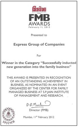 This time the EXPRESS GROUP is presented with FMB award 2012 as a winner of the category Successfully inducted new generation into the Family Business.
